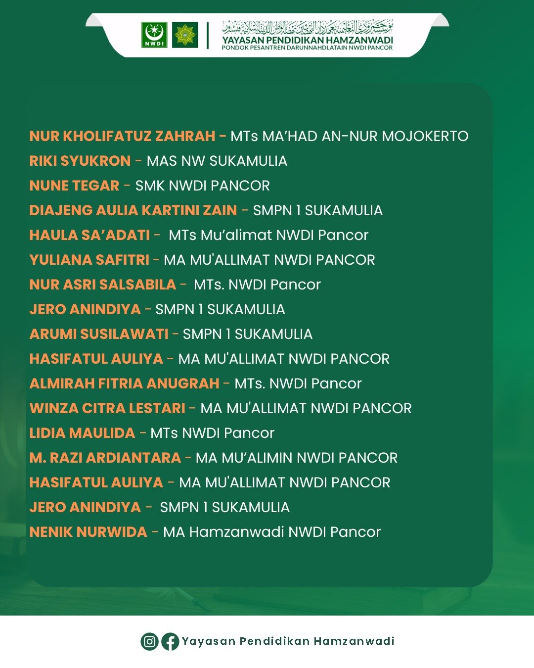 Sebagai bentuk apresiasi, panitia juga menetapkan 20 Peserta Terbaik yang turut mengharumkan sekolah masing-masing melalui karya puisi terbaiknya. Daftar 20 Besar dapat dilihat pada poster pengumuman resmi Yayasan Pendidikan Hamzanwadi.
